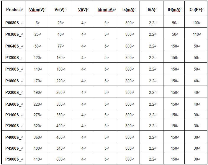 | Series | IPP 2x10µs Amps | IPP 8x20µs Amps | IPP 10x160µs Amps | IPP 10x560µs Amps | IPP 10x1000µs Amps | ITSM60Hz Amps | dI/dt Amps/µs |