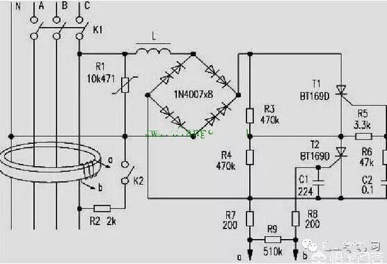 上图为一个三相四线漏电断路器电路图。包括有零序电流互感器,试验按钮,信号放大,可控硅驱动,跳闸脱扣线圈等等。