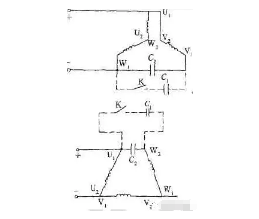 在前文了解到了并入电容裂相的两种接线方式,分别是△形接线与Y形接线。那么拉开式也有两种,一种是拉开Y形裂相,另一种是拉开△裂相。⑴当电动机是Y形接线时,那么就可将三相电动机其中的任意的二绕组,就比如U与W进行串联,将其称为一个主绕组。有了主绕组,就有副绕组,将另外的相绕组进行串联,并配以适当的电容,将其并联在单相电源上。假设C2电容较为合适,那么就能够促使进行并联的支路电流之间的互差值达到90°,从而达到最佳的运行效果。⑵当电动机是△形接线时,其也是分为主绕组与副绕组,但是由于是△形接线的关系,绕组W1W2、V1V2与绕组的U1U2会形成自耦变压器,自耦变压器会有一种升压的情况,这就会导致电容器C2最终承受的电压比单相电源的电压要高,会达到电压值的3倍有余。详细原理可见图4。