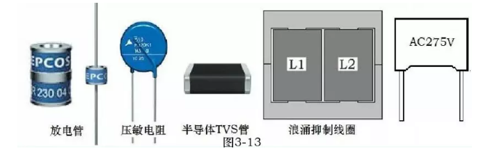 避雷器件主要有陶瓷气体放电管、氧化锌压敏电阻、半导体闸流管(TVS)、浪涌抑制电感线圈、X类浪涌抑制电容等,各种器件要组合使用。
